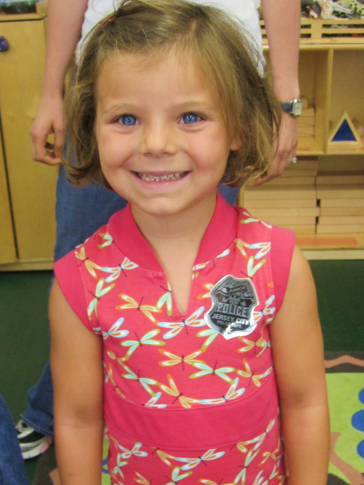 Seeing that the children did such a great job role-playing what to do when a stranger comes up to them, Officer Tosado announced that he would be presenting each child with their own Jr. Police Officer Badge!