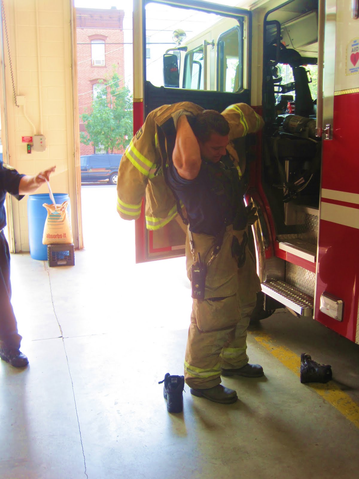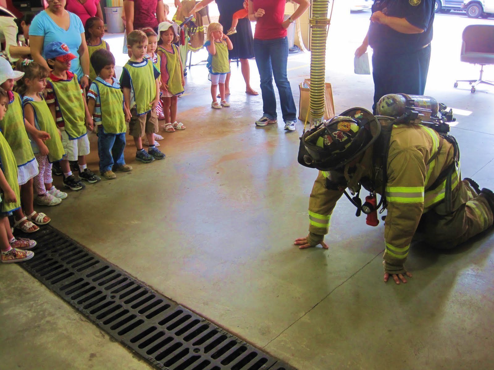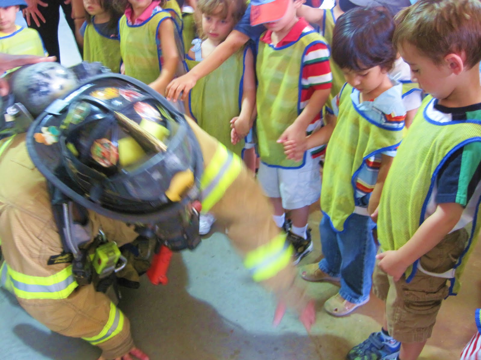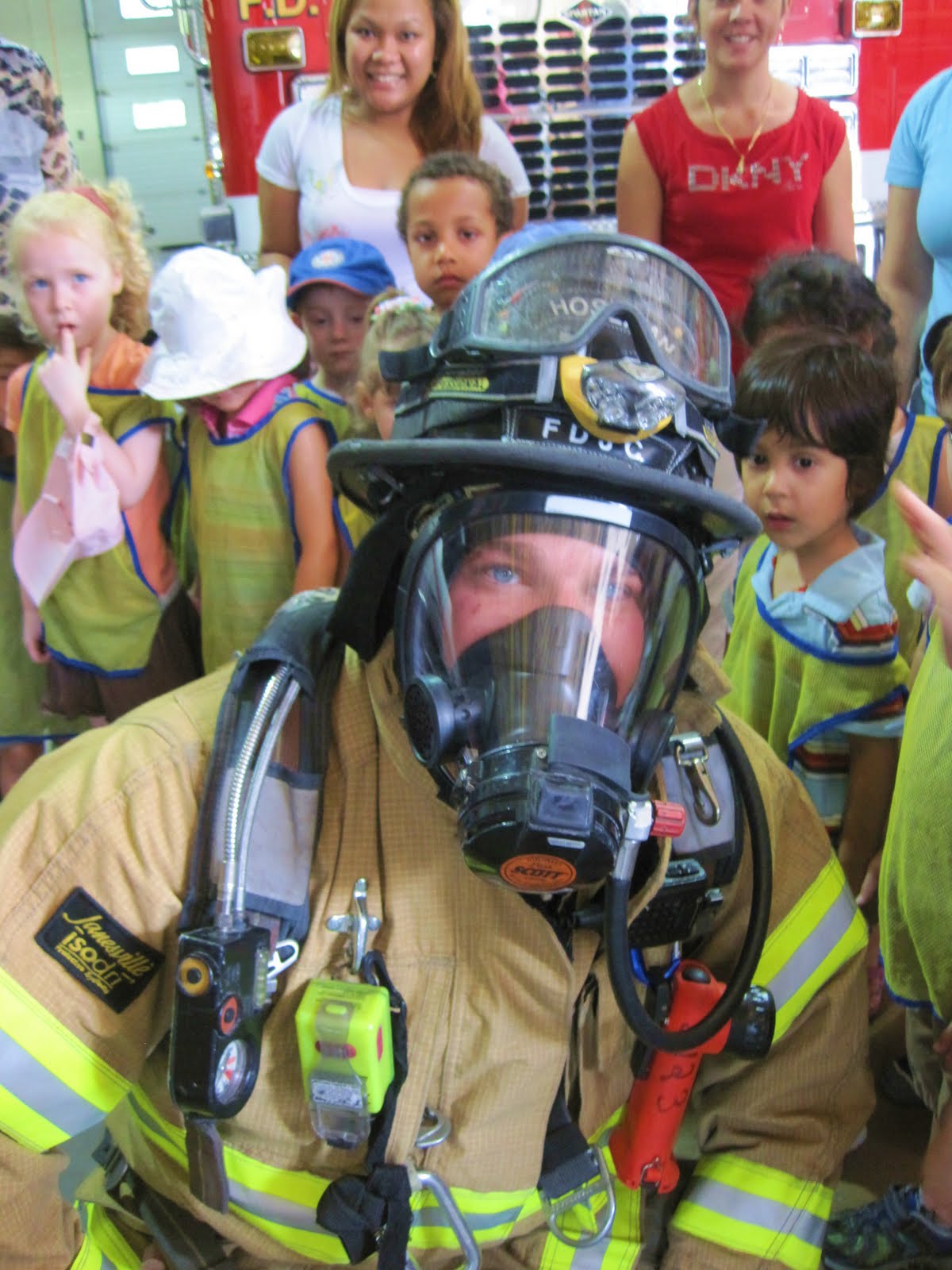 The firefighters spilled out of the fire truck and began showing the children all of the gear they wear, how they put it on, and also the reasons why they wear it.