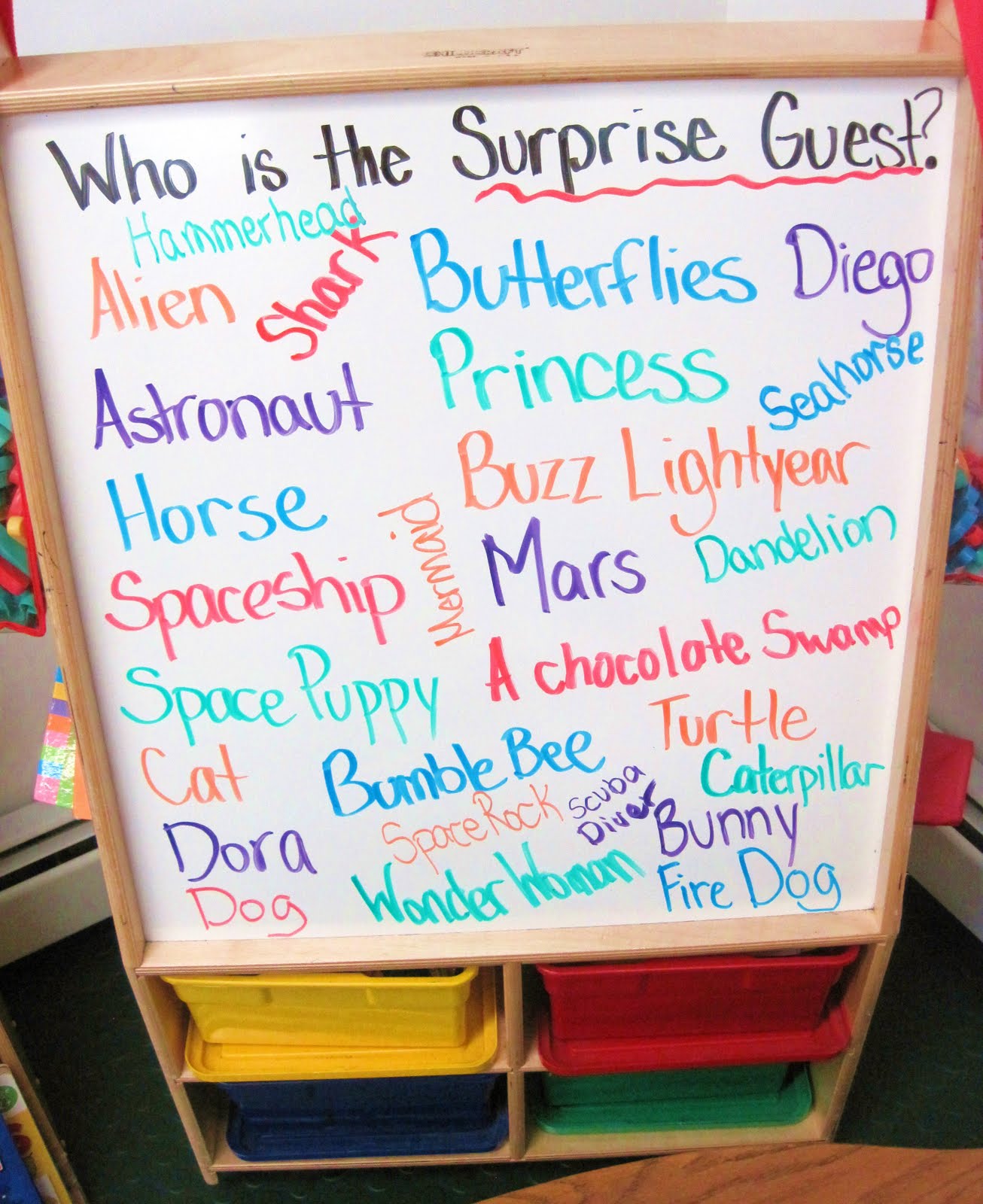 In the afternoon, Park Prep Academy children were paid a very special visit by a larger than life Surprise Guest. Prior to the guest’s arrival, the children brainstormed a list of guesses as to who the surprise guest was. Here is the list they came up with.
