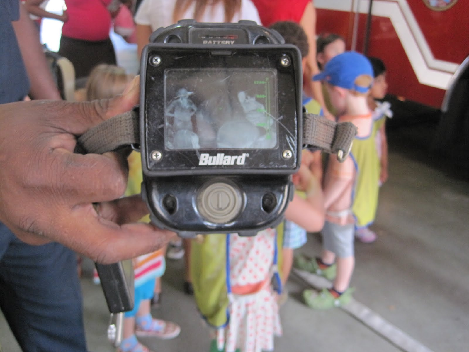 Next, the firefighters showed the children one of the most helpful pieces of equipment that they use when looking for people trapped in a fire. An infrared thermal imaging camera helps firefighter see through smoky, fire-filled rooms by “highlighting” where a human body is based on the level of heat that a human body radiates. If a room is full of fire, the temperature of that room is extremely high or hot (upwards of 1,000 degrees F). A person that is trapped in a fire-filled room stands out in the camera because a human body is at a much cooler temperature (approximately 98 degrees F). Look carefully to see the way the students’ bodies appeared on the screen of the camera while at the firehouse.