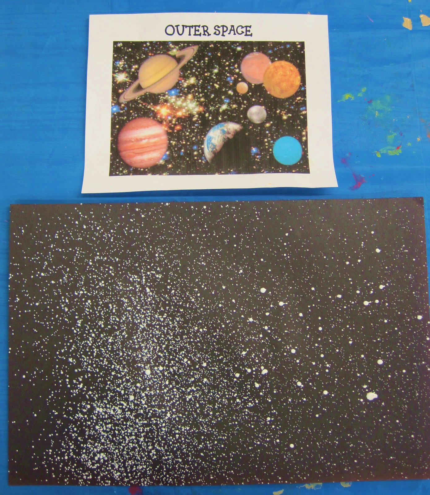 Using black paper and a spray bottle full of white paint, the children spritzed their paper to create the look of stars in space!