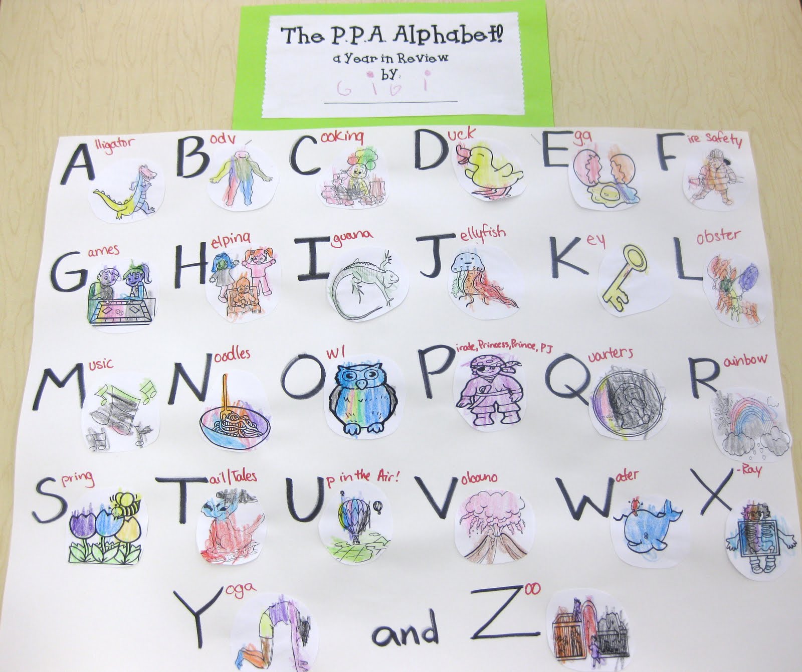If you look closely, you will see that each letter has a picture that corresponds to the weekly themes studied by the PPA students throughout the 2009-2010 school year. Feel free to archive back through the blog to see for yourself! We hope that this super craft helps serve as a tool to reinforce all of the fun and learning that took place throughout this AMAZING school year. Can you go through the poster and see what you remember doing during each letter week?
