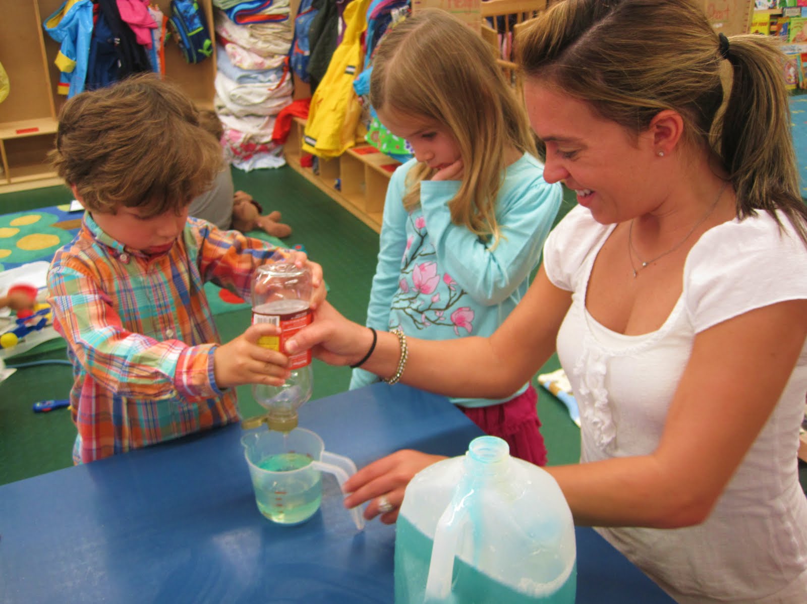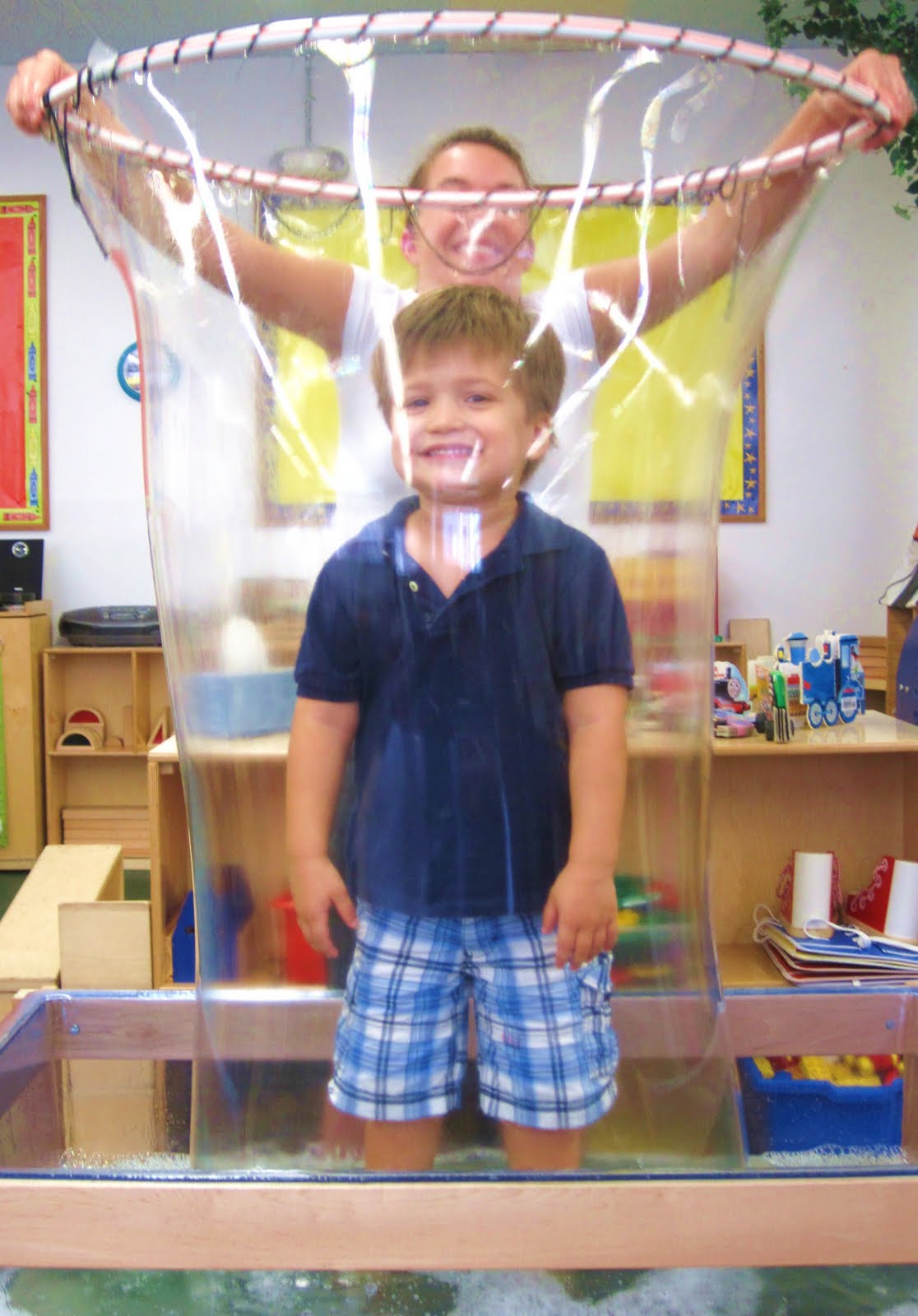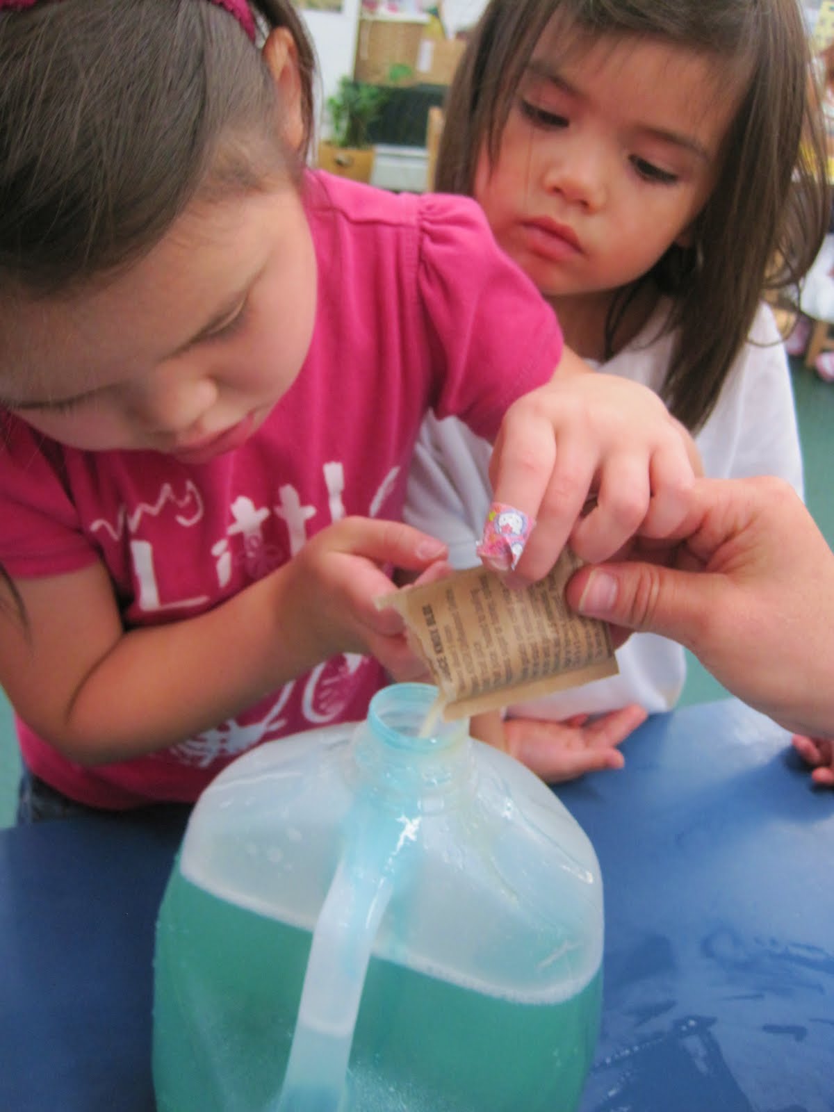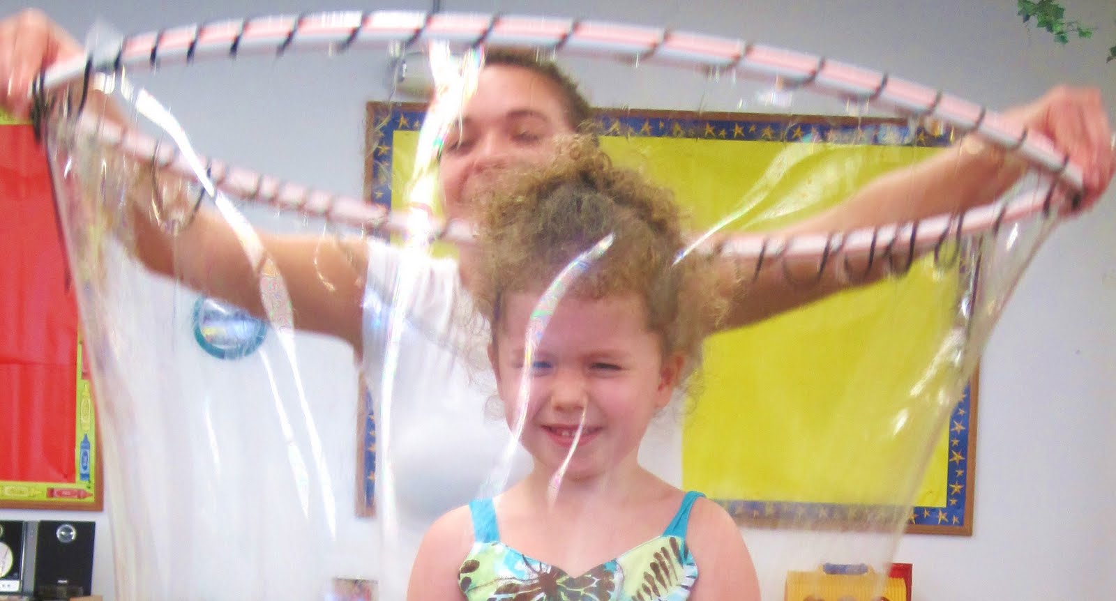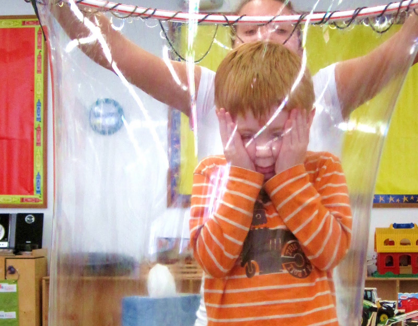 In order to make the full-body bubbles, the children worked with Miss Caitlin to create the special bubble solution using Dawn Dish Soap, Corn Sryup, and Gelatin.