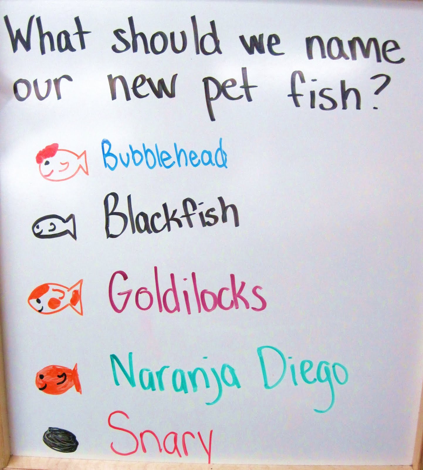 The children waited with bated breath as the first five special guests were brought out. After meeting their new class pet fish and pet snail, the children decided to give them names! Here are the names they came up with.